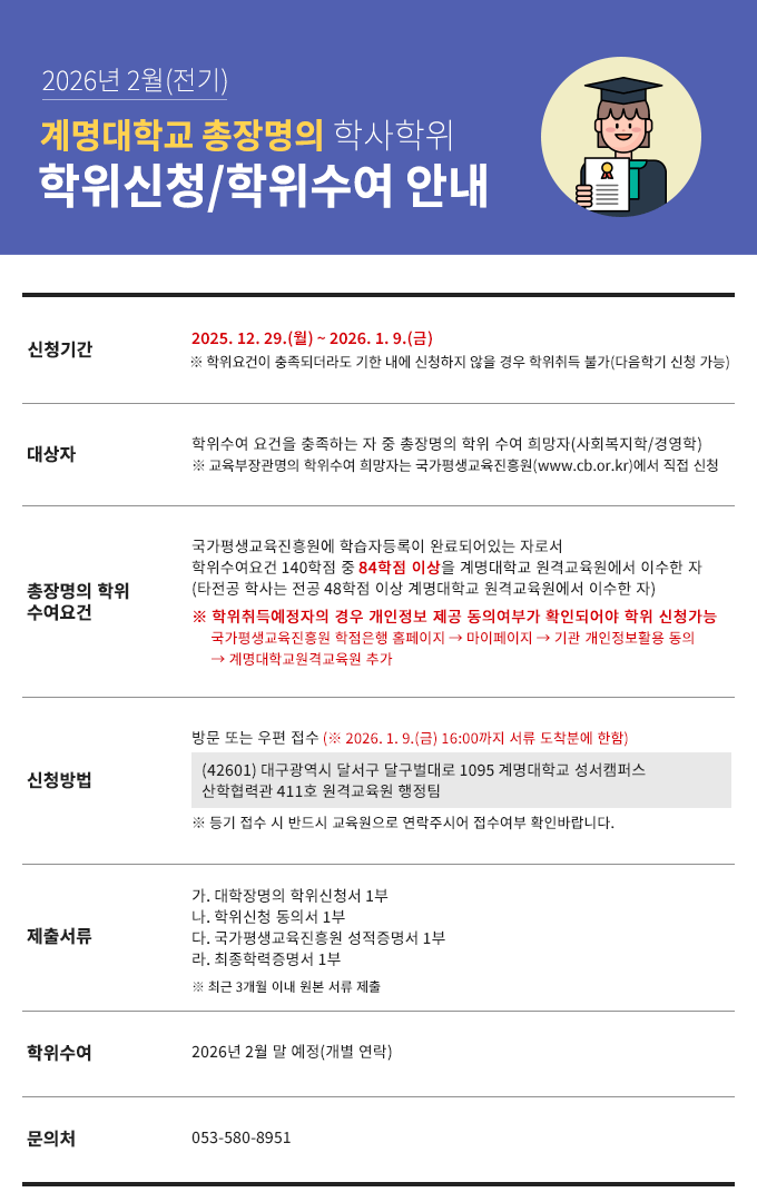 | 제 목 | 2026년 전기(2월) 총장명의 학사학위 신청 안내 | ||
